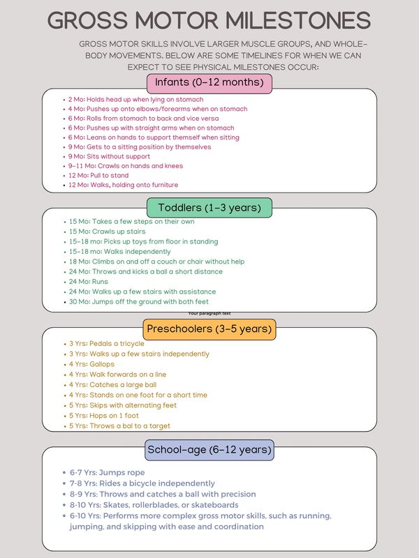 Please see below for general timelines for gross motor development.